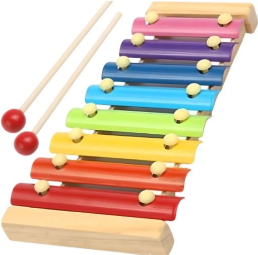 Tęczowe cymbałki to idealna zabawka edukacyjna dla najmłodszych, aby zapoznać ich z muzyką i być może zaszczepić muzyczną pasję na dalsze lata. 8 metalowych blaszek w drewnianej oprawie pozwoli na zagranie 8 różnych tonów (pełna gama), a tym samym doskonale sprawdzi się w graniu prostych melodii. Wystarczy delikatnie uderzyć dołączonymi do zestawu pałeczkami, aby wydobyć z nich dźwięk. Głośność zależy od mocy uderzenia.