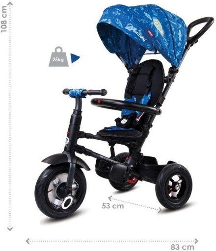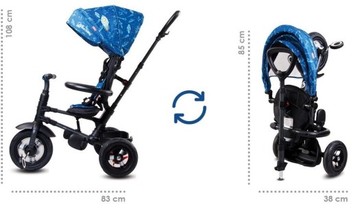 Składany rowerek trójkołowy na pompowanych kołach dla dzieci. Rodzice, którzy pragną zapewnić swoim dzieciom maksimum komfortu i bezpieczeństwa, nie przejdą obojętnie obok tego modelu. Rowerek trójkołowy może być pchany i sterowany przez osobę dorosłą, do chwili aż dziecko nauczy się samodzielnie jeździć i kierować. W gorące, słoneczne dni baldachim chroni dziecko, a w razie potrzeby można go łatwo zdemontować. W koszyku zmieszczą się przydatne drobiazgi, a oparcie z poduszką i pasami zapewnia odpowiedni komfort i bezpieczeństwo!