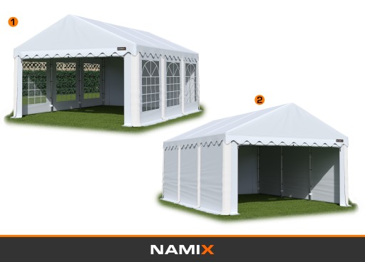 o szerokościach: 3m, 4m, 5m, 6m oraz 8m (dodatkowo namioty można łączyć ze sobą dłuższym bokiem co stwarza nieskończone możliwości)