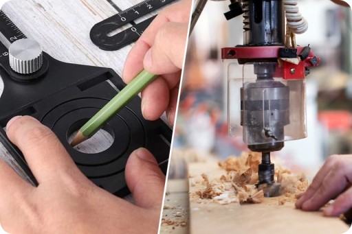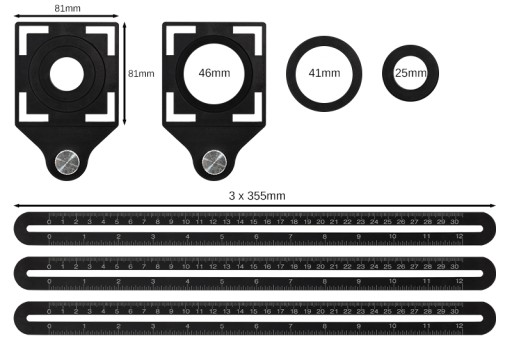 • Głowica do trasowania otworów posiada wycięcia, dzięki którym odrysujesz kwadratowe kształty, a średnica okrągłych otworów jest regulowana (2.5 / 4.1 / 4.6cm) przy pomocy zastosowanych pierścieni.