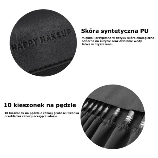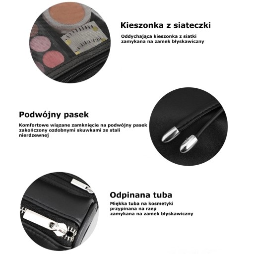 Etui wyposażone zostało w 10 kieszonek na pędzle, oddychającą kieszonkę z siateczki oraz tubę odpinaną na rzep.