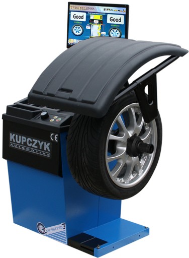 Wyważarka automatyczna do kół Kupczyk wyposażona w laser, sonar do trzeciego pomiaru, pneumatyczny docisk koła oraz monitor LCD.