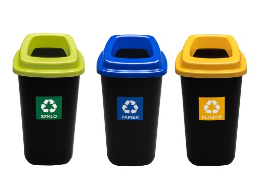 - Kolor: Niebieski - PAPIER, Zielony - SZKŁO, Żółty - PLASTIK;