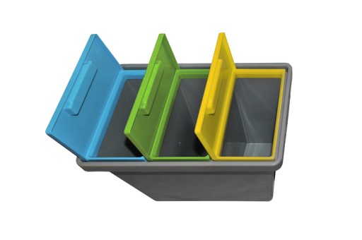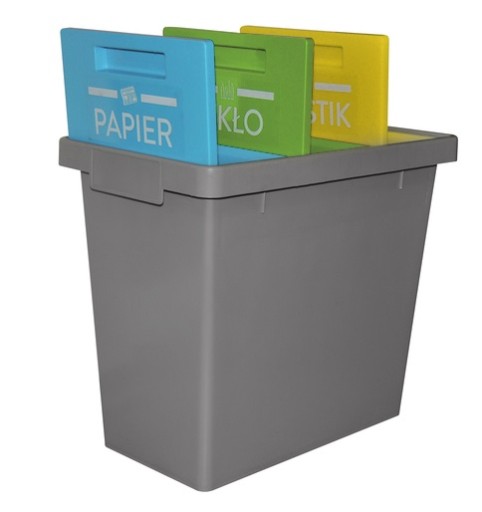 Kosz sprawdzi się u każdego, kto chętnie dba o środowisko. Został podzielony na 3 części (żółty - plastik, zielony - szkło, niebieski - papier). Pojemnik jest wygodny w użytkowaniu, posiada szczelną pokrywę, która skutecznie uniemożliwia wydostawanie się nieprzyjemnych zapachów na zewnątrz. Neutralny kolor idealnie wpasuje się w nawet najbardziej eleganckie wnętrze. Do zestawu dołączamy worki 3x15 sztuk o pojemności 35 litrów - plastik, papier, szkło.