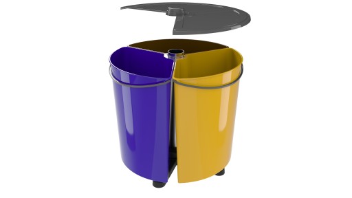 Wyjątkowy kosz do segregacji odpadów z trzema obrotowymi pojemnikami. Zaprojektowanie poszczególnych pojemników na planie wycinka koła pozwoliło na uzyskanie korzystnej kubatury każdego z nich przy niedużych wymiarach zewnętrznych całego kosza.