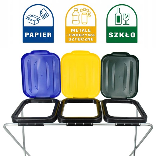 Stojak na śmieci z trzema pokrywkami w kolorach: żółty, zielony i niebieski umożliwia segregację odpadów na plastik, papier i szkło. Produkt składa się ze stelaża ze stali ocynkowanej oraz pokryw z tworzywa sztucznego. Wykonany został z dbałością o szczegóły, dzięki czemu estetycznie się prezentuje.