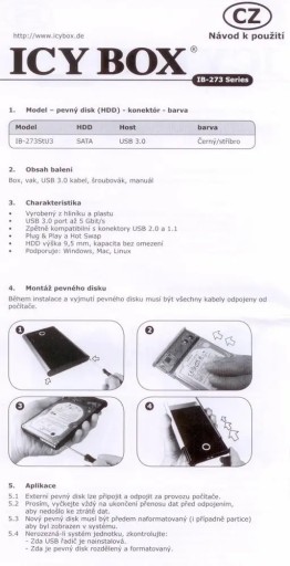 IB-273StU3Zewnętrzna obudowa do dysków 2,5 " SATA HDD / SSD z interfejsem USB 3.0 w stylowym wykonaniu.FUNKCJE- Stylowy, niebieski okrąg w technologii LED informuje o dostępie do dysku twardego i zasilaniu- Zewnętrzny interfejs danych: 1x USB 3.0- Kompatybilny wstecz z USB 2.0 i 1.1- Szybkość transferu: USB 3.0 do 5 Gbit / s- Obsługiwane systemy operacyjne: Windows, Mac i Linux- Wysokość dysku twardego do 9,5 mm, brak ograniczenia pojemności dysku twardego- Plug & Play i Hot Swap- W zestawie z wysokiej jakości etuiMała czarnaIB-273StU3 posiada miejsce na dysk o rozmiarze 2,5 " w technologii SATA o dowolnej wielkości. Urządzenie współpracuje z komputerami stacjonarnymi, laptopami, odtwarzaczami multimedialnymi, telefonami czy telewizorami. Jedyne co jest wymagane to połączenie USB, najlepiej z wykorzystaniem najszybszego interfejsu, czyli USB w wersji 3.0. Przy pomocy interfejsu USB 3.0 transmisja danych wynosi aż do 5 Gbit / s.Obudowa wykonana jest z twardego plastiku zapewniającego bardzo dobre właściwości ochronne oraz z aluminium, który idealnie odprowadza ciepło. IB-273StU3 posiada kompaktowe wymiary, przez co jest idealnym kompanem w podróży. W zestawie znajdziemy wysokiej jakości etui na obudowę, które chroni przed ewentualnymi rysami powstającymi w transporcie. Obudowa IB-273StU3 sprawdzi się w każdych warunkach.Doskonałe połączenie materiałówPlastik redukuje wagę, a aluminium doskonale odprowadza ciepło, zatem Twój dysk HDD / SSD może działać dłużej, nawet bez użycia wentylatora. Wymiana dysku twardego jest niezwykle prosta, wystarczy zdjąć osłonę i wymienić dysk.Wygodny w podróżyLekki materiał IB-273StU3 sprawia, że idealnie sprawdza się w podróży. Aby chronić Twój dysk przed kurzem i zadrapaniami, w zestawie dołączoną wysokiej jakości etui ochronne. Przy pomocy interfejsu USB 3.0 transmisja danych wynosi aż do 5 Gbit / s. Dlatego praca z dużymi plikami, oglądanie filmów czy zdjęć jest szybka i wygodna! Obudowa jest kompatybilnie wsteczna z USB 2.0 a nawet 1.1.Gorący towarSzybka wymiana dysku podczas pracy (HotSwap) i obsługa Plug & Play pozwalają użytkownikowi na bezproblemowe używanie wielu dysków twardych w obudowie.