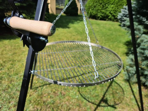 Trójnóg wyposażony jest w kołowrotek do regulacji wysokości rusztu, linkę, ocynkowane łańcuchy oraz karabińczyki do zawieszenia rusztu, w skład zestawu wchodzi też nierdzewny ruszt.