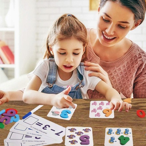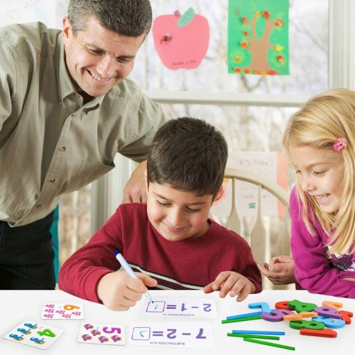 Patyczki wraz z cyframi pasującymi do obrazków, tablice z działaniami matematycznymi, na których Twoje Dziecko wpisze poprawy wynik za pomocą ścieralnego markera, a gdy się pomyli wytrze dołączoną szmatką. Zestaw może być przechowywany w dołączonym specjalnym woreczku.