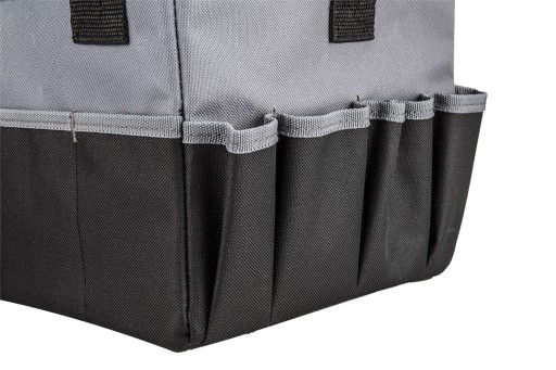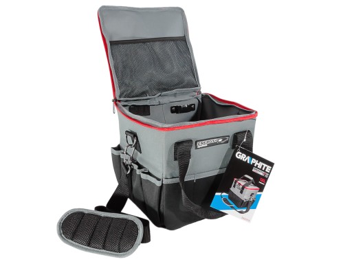 Torba GRAPHITE została zaprojektowana z myślą o wygodnym przenoszeniu oraz wkładaniu i wyjmowaniu elektronarzędzi i akcesoriów. Regularny kształt umożliwia wygodne rozłożenie narzędzi i akcesoriów w komorze głównej, 14 zewnętrznych oraz 3 wewnętrznych kieszeniach. Wnętrze torby posiada również specjalne zaczepy i paski na rzep, aby jej zawartość nie przemieszczała się podczas transportu. Torba pomieści jednorazowo 2 elektronarzędzia wraz z osprzętem (np. akumulator, ładowarka, akcesoria). Torba wykonana jest z wytrzymałego poliestru oraz posiada regulowany pasek na ramię, wodoodporne dno z nóżkami oraz okienko na personalizowaną etykietę.