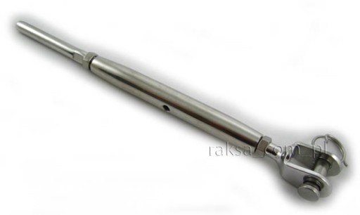 Ściągacz wykonany ze stali nierdzewnej, zakończony końcówkamą widełkową oraz końcówką do zawalcowania na linie stalowej o średnicy 2,5mm.