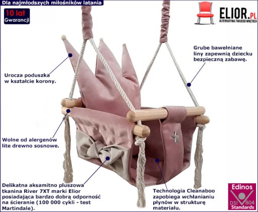 - Huśtawka Rolly powstała z myślą o najmłodszych użytkownikach, nic więc dziwnego, że bezpieczeństwo i najwyższa jakość materiałów to nasz priorytet. Tapicerka zabawki to wysokiej klasy, przyjemny w dotyku aksamitno - pluszowy materiał River 7XT marki Elior. Tkanina jest lekka, odporna na uszkodzenia i nieziemsko delikatna. Modna szara lub różowa kolorystyka dodatkowo podkreśla oryginalny design zabawki.