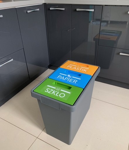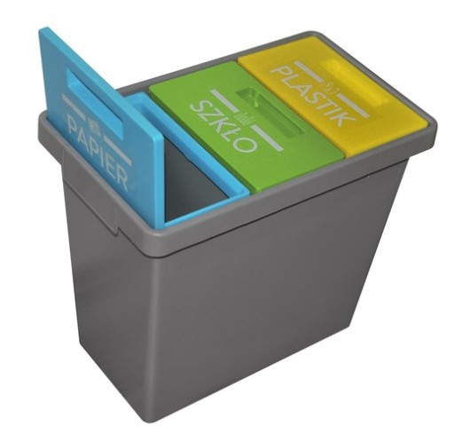 - Kolor: Niebieski - PAPIER, Zielony - SZKŁO, Żółty - PLASTIK;