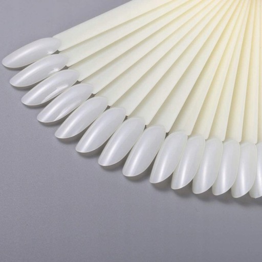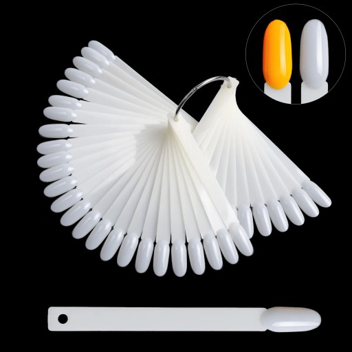 Praktyczny wzornik lakierów z 50 tipsami w kolorze mlecznym w kształcie migdała. Próbnik w formie wachlarza na metalowym kółku. Będzie bardzo pomocny podczas wybierania koloru lakieru lub wzorku na paznokcie. To bardzo czytelna, wygodna oraz estetyczna paleta do malowania lakierami klasycznymi, hybrydowymi lub żelami. Wzornik jest poręczny, solidnie wykonany, przydatny w każdym salonie kosmetycznym.