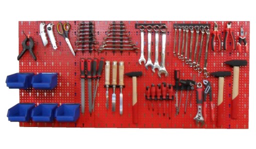 - 23 zawieszki, w tym: 14 sztuk blaszanych na klucze płaskie, młotki, pilniki, dłuta, wkrętarki, klucze oczkowe małe i duże, wiertła, 9 sztuk drucianych: 3 długie (110 mm, fi 4 mm), 3 średnie (90 mm, fi 3 mm), 3 krótkie (70 mm, fi 3 mm),