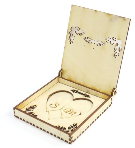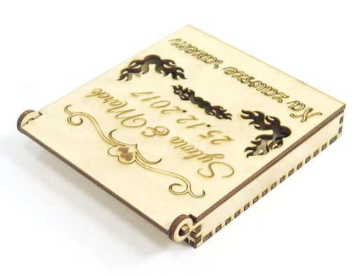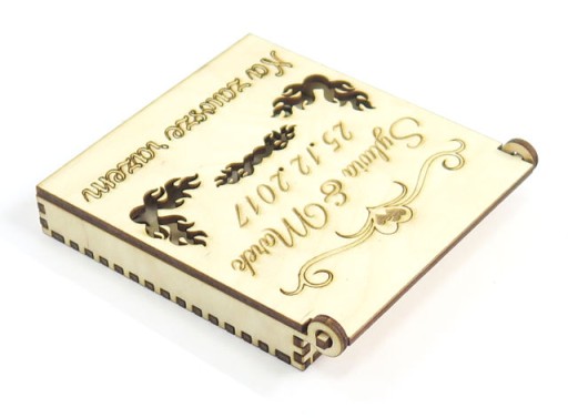 Pudełko ze sklejki o grubości 3mm z otwieraną przykrywką o zewnętrznych wymiarach: 10x10x1.5cm z grawerem