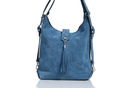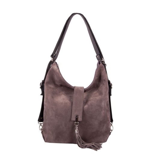 Uszyta w Polsce skórzana torebka PLECAK z wysokogatunkowej naturalnej skóry licowej z fakturą groszku połączonej z zamszem. Zamykana od góry na zamek. Wewnątrz dwie komory, dwie kieszonki na zamek + kieszonka na telefon. Z tyłu pojemna kieszeń na zamek( pozioma lub pionowa). Wnętrze wykończone podszewką. Okucia w kolorze srebrnym. Można nosić na ramieniu jak torebkę lub na plecach jako plecak. Torebka z ozdobnym frędzlem.