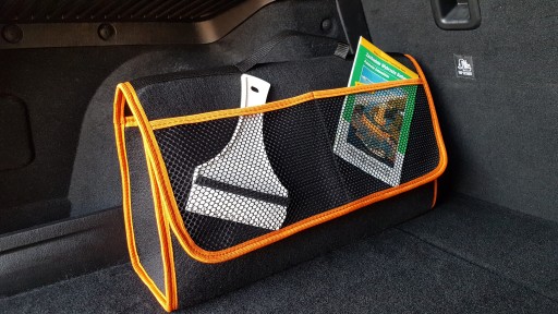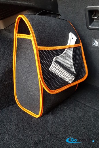 Organizer - torby do bagażnika o kolorze czarnym zaś brzegi obszyte są pomarańczowymi wstawkami