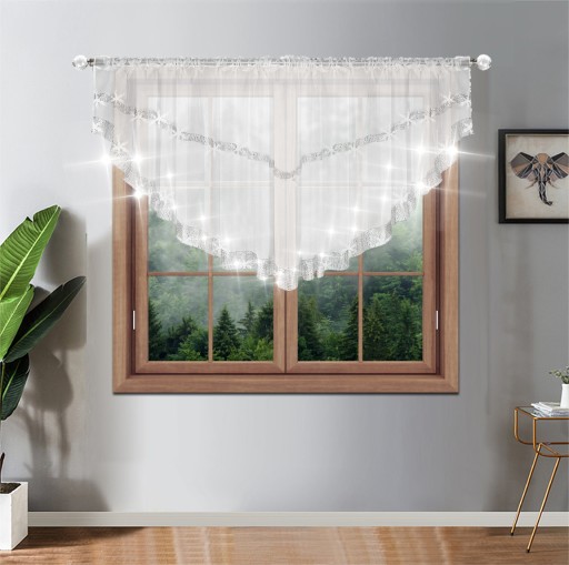 Prezentowana firana woalowa z cyrkoniami w dolnej części została wykończona w kształt łuku. Po zawieszeniu tworzy zachwycający efekt subtelnego V, który znakomicie podkreślony został przez ozdobę w postaci taśmy cyrkoniowej. Podwójne zdobienie cyrkoniami zapewnia wyjątkowy efekt wizualny. Taśma cyrkoniowa, przechodząca przez środek firany posiada szerokość 3 cm, natomiast wieńcząca ją w części dolnej, szerokość 6 cm. Efektowne zdobienie w postaci cyrkonii sprawia, ze firana prezentuje się doskonale we wnętrzach, urządzonych w modnym stylu glamour. Można zastosować ją samodzielnie oraz w zestawie z zasłoną. Znakomity efekt dekoracyjny tworzy firana z cyrkoniami, w połączeniu z kwitnącymi na parapecie roślinami, dekoracyjnymi świecami oraz oświetleniem typu cotton balls. Firana gotowa z cyrkoniami jest efektownym, łatwym w zastosowaniu elementem dekoracyjnym, który wzmacnia elegancki wystrój pomieszczenia. Nienaganny, gładki woal w śnieżnobiałym odcieniu oraz mieniące się w świetle cyrkonie tworzą zachwycający efekt, widoczny z każdego miejsca pomieszczenia.
