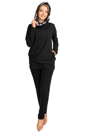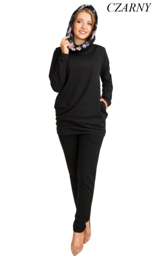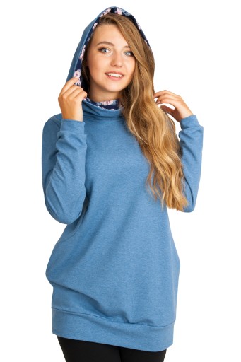 Bluza ma długość do uda, dzięki czemu może pełnić rolę tuniki. Jej niepowtarzalnym atutem jest wysoki wzorzysty szalo-kaptur .