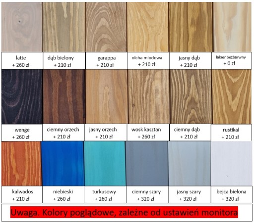 - wenge, latte, niebieski, turkusowy - naturalne drewno sosnowe bejcowane na konkretny kolor, pokryte podwójną warstwą lakieru bezbarwnego (półmat). Przy wyborze tego koloru do ceny łóżka należy doliczyć 260 zł.