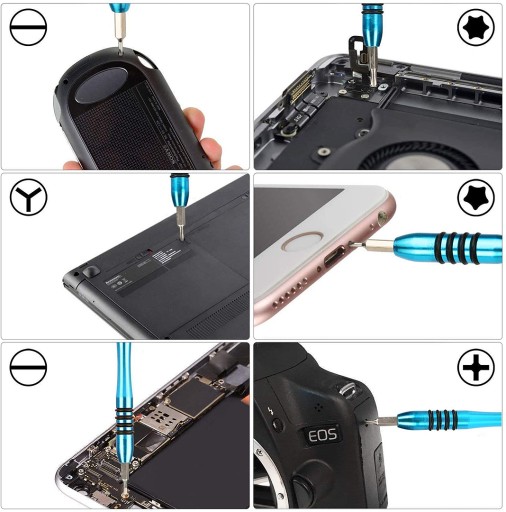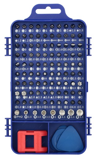 Zestaw 110 precyzyjnych narzędzi, bitów i otwieraków z lekkim aluminiowym uchwytem przeznaczony do precyzyjnych napraw serwisowych telefonów i smartfonów w tym produktów marki Apple oraz wszelkiej elektroniki konsumenckiej.