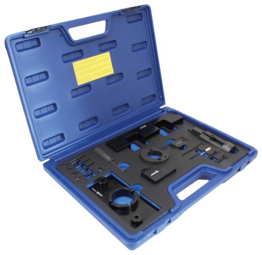 Specjalistyczny zestaw umożliwiający wymianę paska napędowego wałka rozrządu, blokadę łańcucha, blokowanie koła zamachowego w samochodach z automatyczną skrzynią biegów i wymianę łańcucha napędowego wałka rozrządu przy głowicy cylindrów.
