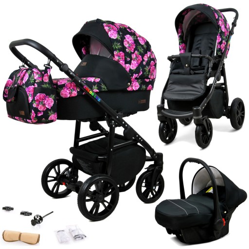 Color Lux 3w1 to wielofunkcyjny wózek z najnowszej kolekcji znanej, europejskiej marki BabyLux. Może być używany jako wózek głęboki, spacerowy oraz fotelik samochodowy z możliwością montażu na ramie wózka. Wykonany z najwyższej jakości tkanin typu Exclusive posiadających certyfikat OEKO-TEX STANDARD 100 w kolorze Bouquets Peony On Black, który nie tylko prezentuje się niezwykle elegancko, ale jest także bardzo odporny na blaknięcie oraz wilgoć. Ekskluzywne tkaniny zapewniają także podróżującemu dziecku idealną temperaturę oraz wilgotność powietrza niezależnie od panujących warunków atmosferycznych. Dla maksymalnej funkcjonalności oraz komfortu użytkowania wiele elementów wózka takich jak prowadnica, barierka oraz podnóżek spacerówki zostało wykonane z wytrzymałej ekoskóry. Dzięki czemu produkt posłuży przez długi okres czasu.