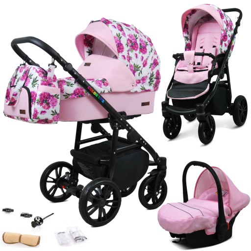 Color Lux 3w1 to wielofunkcyjny wózek z najnowszej kolekcji znanej, europejskiej marki BabyLux. Może być używany jako wózek głęboki, spacerowy oraz fotelik samochodowy z możliwością montażu na ramie wózka. Wykonany z najwyższej jakości tkanin typu Exclusive posiadających certyfikat OEKO-TEX STANDARD 100 w kolorze Bouquets Peony On White, który nie tylko prezentuje się niezwykle elegancko, ale jest także bardzo odporny na blaknięcie oraz wilgoć. Ekskluzywne tkaniny zapewniają także podróżującemu dziecku idealną temperaturę oraz wilgotność powietrza niezależnie od panujących warunków atmosferycznych. Dla maksymalnej funkcjonalności oraz komfortu użytkowania wiele elementów wózka takich jak prowadnica, barierka oraz podnóżek spacerówki zostało wykonane z wytrzymałej ekoskóry. Dzięki czemu produkt posłuży przez długi okres czasu.