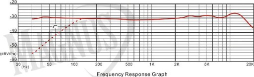 Przetwornik: True Condenser Charakterystyka kardioidalna Pasmo przenoszenia: 20Hz-20kHz Częstotliwość: -37dB±2dB (0dB=1V/Pa - 1kHz) Impedancja wyjściowa: 100Ω±30% (1kHz) Poziom szumów: ≤20dB A (IEC 581-5) Max. wejściowe SPL: 130dB (at 1kHz≤1% T.H.D) Bass Filter: 10dB /octave - 100Hz Zasilanie: Phantom - 48V DC