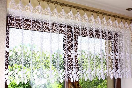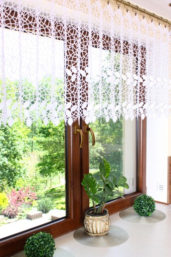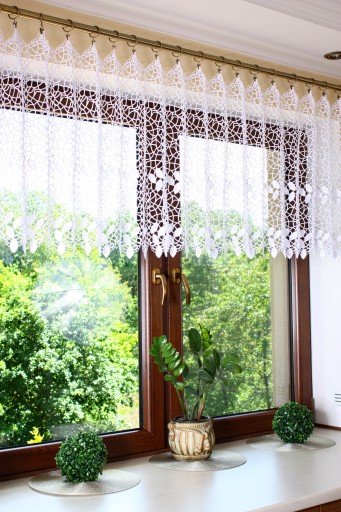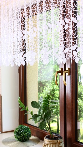 Przedmiotem sprzedaży jest gipiurowa firanka kuchenna typu zazdrostka na szelkach o wysokości całkowitej 94 cm . Firaneczka jest cięta z walka i nie wymaga obszywania , bardzo ważną cechą jest również to że nie trzeba jej prasować, dodatkowa zaletą jest fakt że można taką zazdrostkę powiesić również na żabkach karnisza