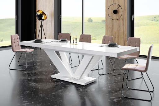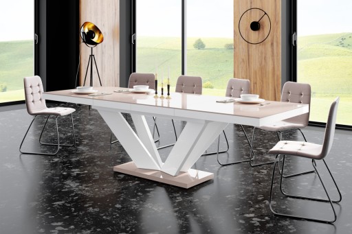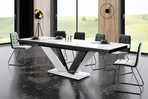 Poza walorami estetycznymi stół Viva 2 jest stołem bardzo praktycznym. Posiada funkcję rozkładania od 160 cm do 256 cm (dwie wkładki powiększające chowają się pod blatem stołu). Kolorystyka stołu idealnie wpasowuje się we współczesny trend czerń/biel/szarość a lustrzany połysk (stół wykonany jest z akrylu na wysoki połysk) zachwyca osobliwym urokiem i eleganckim wyglądem.