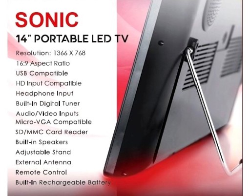 Są zwykłe tv ....I jest Nowy przenośny tv SONIC - pełny doskonałych rozwiązań dzięki którym mniejszym wysiłkiem będziesz cieszyć się z walorów użytkowych.Stylowy wygląd urządzenia sprawia że czujesz się z nim dobrze od momentu gdy pierwszy raz weźmiesz go do ręki i zaczniesz używać .Wyposażony jest w precyzyjne podzespoły wysokiej jakości .Co więcej jest wyjątkowo łatwy w użyciu .Ma starannie przemyślany układ przycisków i proste menu .Bezkonkurencyjna wielofunkcyjność niepowtarzalny i nowoczesny design bezkompromisowa i wysoka jakość wykonania oraz niezawodność za przystępną cenę pozostawiają daleko w tyle innych producentów tego typu urządzeń.Perfekcyjnie przemyślane w każdym detalu charakteryzujące się praktycznymi rozwiązaniami które zapewniają bezproblemowe korzystanie z urządzenia każdemu użytkownikowi Dzięki tym atutom jakie posiadają wszystkie produkty firmy SONIC kupujesz dokładnie to czego szukasz i potrzebujesz dla siebie i rodziny