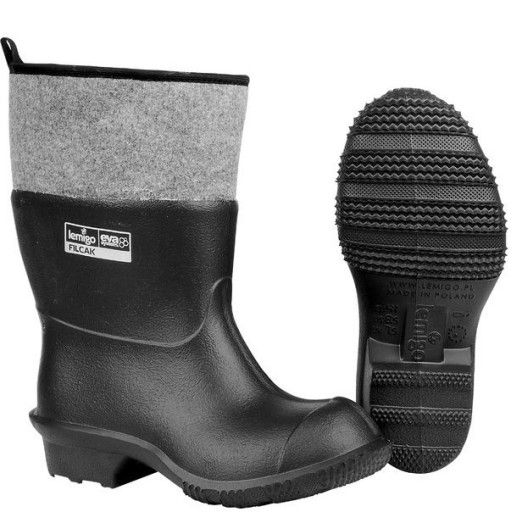 Wykonane z super lekkiego tworzywa EVA tak zwane "gumofilce" od Lemigo. Dodatkowo wykonane zostały z wkładem filcowym. Filc wykończony został ozdobną lamówką, której zakończenie ułatwia zakładanie buta. Posiadają wysoki przegub ułatwiający wygodne wkładanie i zdejmowanie buta.