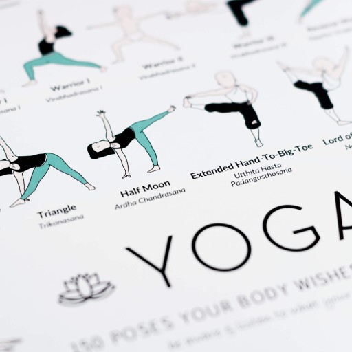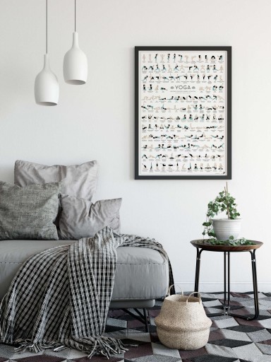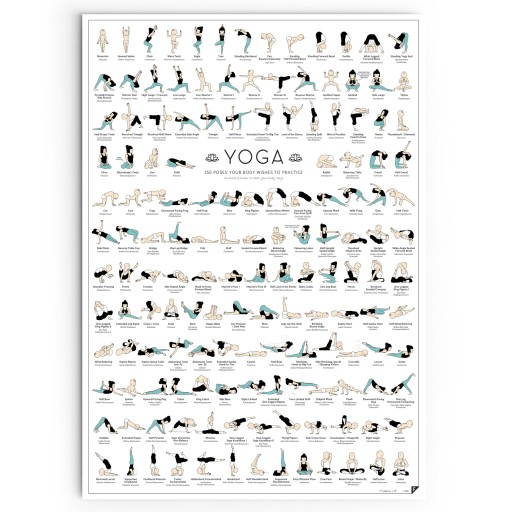 Infografika ze 150 pozycjami jogi, zwanych asanami. Trudność wykonania asan zobrazowana została przez trzy postacie – dziecko, kobietę, jogina. Jednak pamiętajmy, że jest to klasyfikacja orientacyjna – sami czujemy najlepiej, czy dana pozycja nie jest dla nas zbyt trudna na obecnym etapie. Pamiętajmy, że ciało i ścięgna powinny być rozciągane powoli, regularnie i stopniowo, a niektórymi asanami można „pochwalić się” dopiero po latach praktyki.