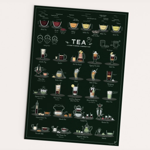 Plakat „TEA - a Guide to Brew a Perfect Cup” to kompendium wiedzy na temat herbaty. Dowiesz się jak zaparzyć różne gatunki i rodzaje, jak ją odpowiednio przechowywać, jak perfekcyjnie zagotować wodę. Tutaj znajdziesz sposoby przygotowania herbaty w najróżniejszych odsłonach i przepisy z całego świata.