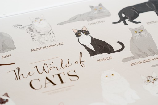 Plakat „The Worlds of Cats” zawiera 40 szczegółowych ilustracji ras kotów uznawanych przez międzynarodowe stowarzyszenia felinologiczne CFA, FIFe i TICA. Znajdziesz tutaj zarówno łagodnego kota perskiego jak i dumnego, ale towarzyskiego brytyjskiego krótkowłosego oraz kota domowego - ulubieńca polskich domów.