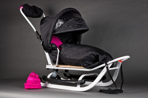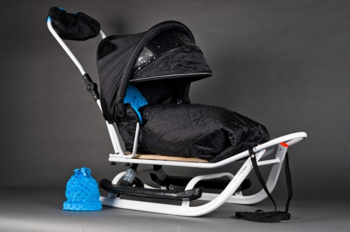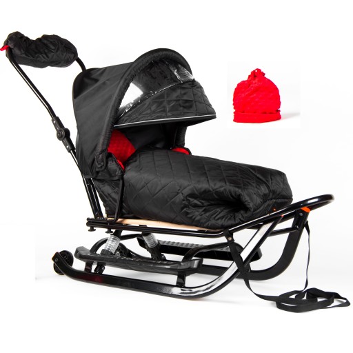 Sanki z amortyzatorami, śpiworem, budką, mufką, czapką i podnóżkami w wersji all inclusive.