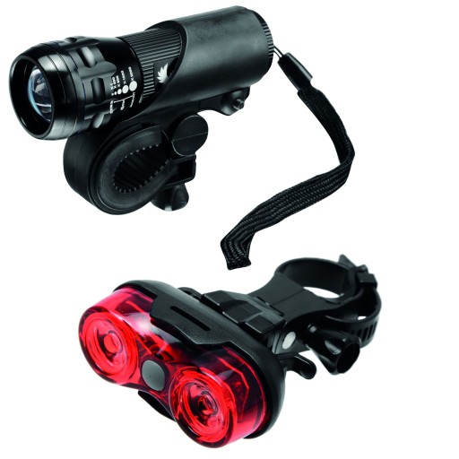 Zestaw lekkich bateryjnych lamp rowerowych. Przednia lampka może służyć jako lampka rowerowa lub jako latarka ręczna. Wykonana jest z aluminium lotniczego. 1W dioda LED generuje wyjątkowo mocne światło. Tylna lampa wyposażona jest w dwie diody LED o wyjątkowej intensywności.