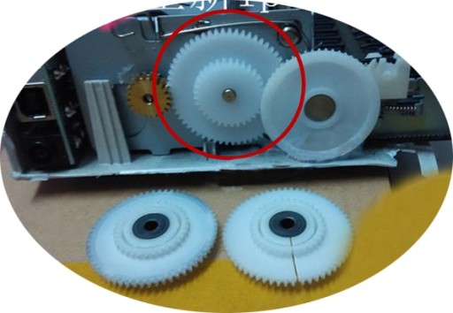 Uszkodzenie tej zębatki (widoczne na zdjęciu obok) jest dość popularne w tych modelach, fabrycznie ten element jest zrobiony z dwóch części, zewnętrznej - z tworzywa i wewnętrznej - z metalu. Metalowa część wbijana jest w część plastikową i z czasem plastik pęka i mechanizm blokuje się na tym pęknięciu, a urządzenie generuje szeroki wachlarz nietypowych dźwięków i komunikaty błędów (najczęściej sygnalizuje 4 pomarańczowe mrugnięcia diodą).
