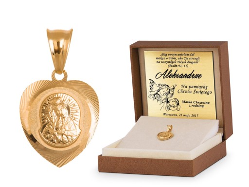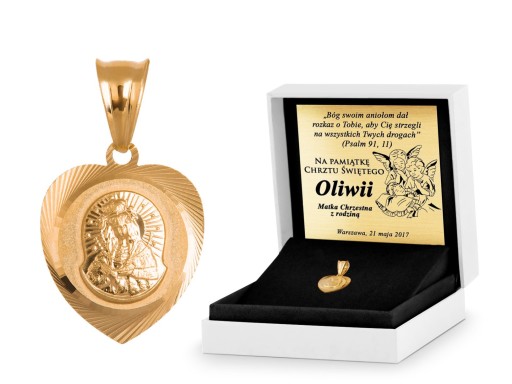 Złocony Medalik wykonany z najwyższej próby srebra 925 to doskonała propozycja na tradycyjną, ponadczasową pamiątkę chrztu uwieczniającą w szlachetnym kruszcu wyjątkowy dzień obmycia z grzechu pierworodnego. Medalik przedstawiający Matkę Boską jest skomponowany w kształcie bogato zdobionego serca. Precyzyjne wykonanie przedstawienia pozwala dostrzec nie tylko zarys postaci, lecz także gwieździstą koronę unoszącą się nad głową Maryi.