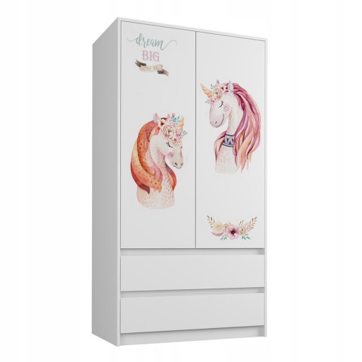 Szafa wykonana jest z płyty wiórowej w kolorze białym, wykończona okleiną. Posiada ona drążek na wieszaki, cztery półki i dwie szuflady na dole. Drzwi pokryte są kolorowym nadrukiem. Nadruk posiada ładne żywe kolory, dodatkowo zabezpieczony jest specjalnym laminatem, aby nie uległ wyblaknięciu lub ścieraniu. Można bez obaw myć go ściereczką i płynem.