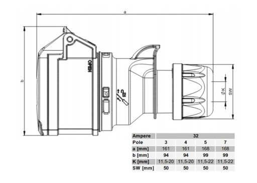 - stopień ochrony klasy IP 44, gniazdo i wtyczka marki PCE wielokrotnego użytku skręcane nie zalewane, 32A