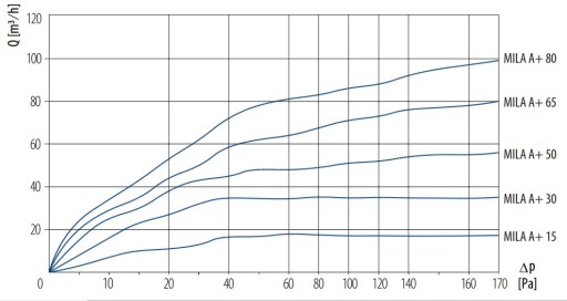 W kratce MILA A+ z przepustnicą strumień powietrza regulowany jest w zależności od różnicy ciśnienia między powietrzem w pomieszczeniu a ciśnieniem w układzie wentylacji. Przepustnica otwiera się lub zamyka powodując odpowiednio zwiększenie, lub zmniejszenie strumienia wywiewanego powietrza.