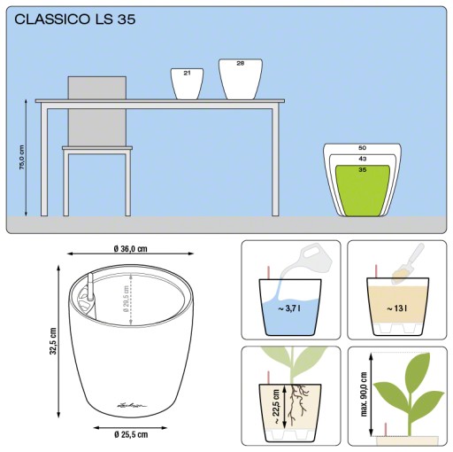 Donica CLASSICO LS to młodsza siostra donicy Classico w dotychczas znanej wersji. Od swej poprzedniczki odróżnia ją wymienny wkład, który sprawia, że zmiana aranżacji rośliny staje się przyjemnością – można ją z łatwością przenieść do innej donicy z serii Classico LS 35. Wkład ten jednocześnie zapewnia roślinie większą ochronę przed mrozem. Eleganckim wykończeniem wkładu jest rama w kolorze donicy, która ułatwia wyjmowanie i przemieszczanie wkładu. Sprawia ona również, że donica CLASSICO LS bardzo dobrze komponuje się z donicami Rondo.