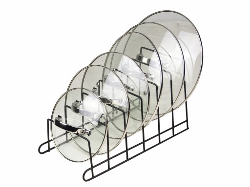 Wygodna konstrukcja stojaka pozwala na łatwe umieszczenie pokrywek i szybki dostęp do nich. Dzięki temu można bez problemu znaleźć właściwą pokrywkę do garnka czy patelni, co zwiększa komfort podczas gotowania.