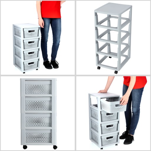 Wysokiej jakości materiał z jakiego wykonano regał sprawia, że komoda jest solidna i trwała. Regał składa się z czterech szuflad o pojemności 11L i pozwala na łatwe zorganizowanie przestrzeni. Prezentowana komoda zapewnia, że przechowywane przedmioty są zabezpieczone przed uszkodzeniami, zabrudzeniami oraz działaniem innych czynników zewnętrznych. Dołączone do mebla praktyczne kółeczka pozwalają na swobodne jego przemieszczanie.