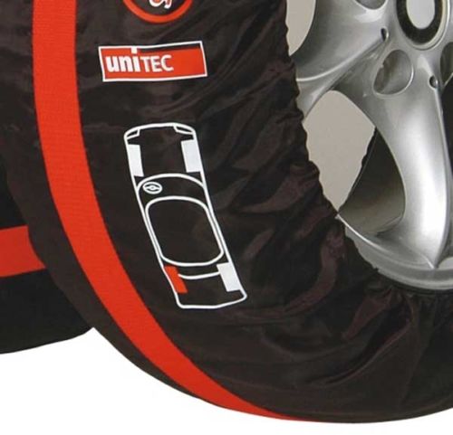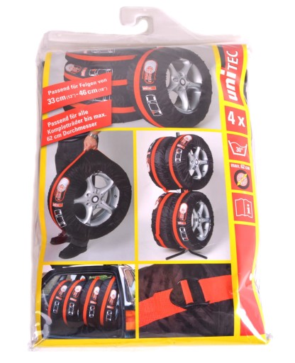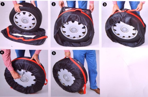 Pokrowce na opony posiadają oznakowanie położenia opon oraz specjalny uchwyt do łatwego przenoszenia oraz powieszenia.