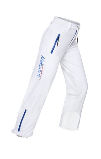 Materiał jest w 100% poliestrowy, softshellowy, wodoodporny, wysoce oddychający i izolowany. Istnieją dwie boczne kieszenie, elastyczna talia, a na kostkach klapy na rzepy, a także pionowe zamki po bokach.