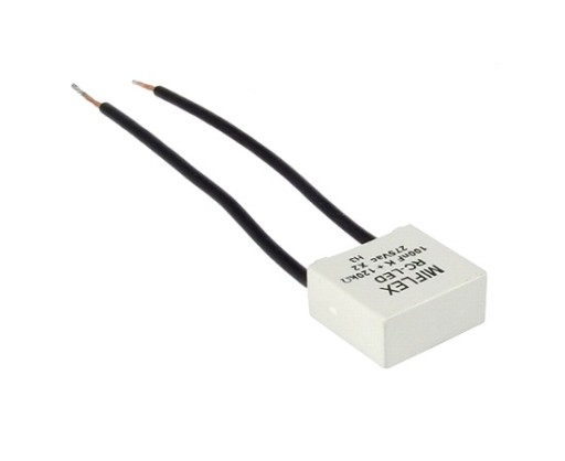 Dane Techniczne: - Pojemność: 100nF (0.1uF) + 120K ohm - Napięcie: 275VAC - Wyprowadzenia: 2 przewody - Długość przewodów: 8cm - Wymiary: 8x18x17mm - oznaczenie: RC-LED - Producent: MIFLEX